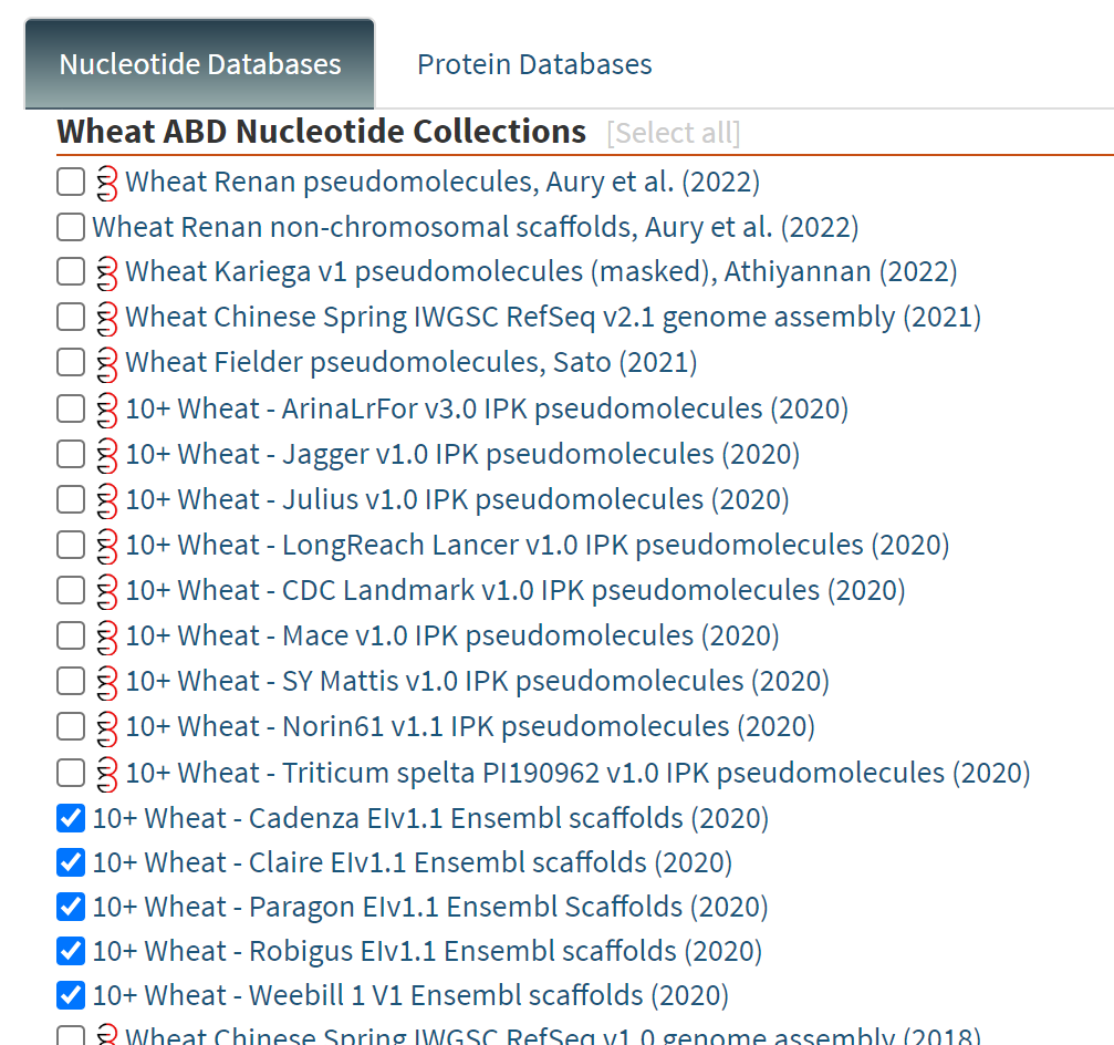 GrainGenes Released 5 addiional Wheat 10+ cultivar BLAST databases Cadenza, Claire, Paragon, Robigus, & Weebill adding to the 10 existing cultivars