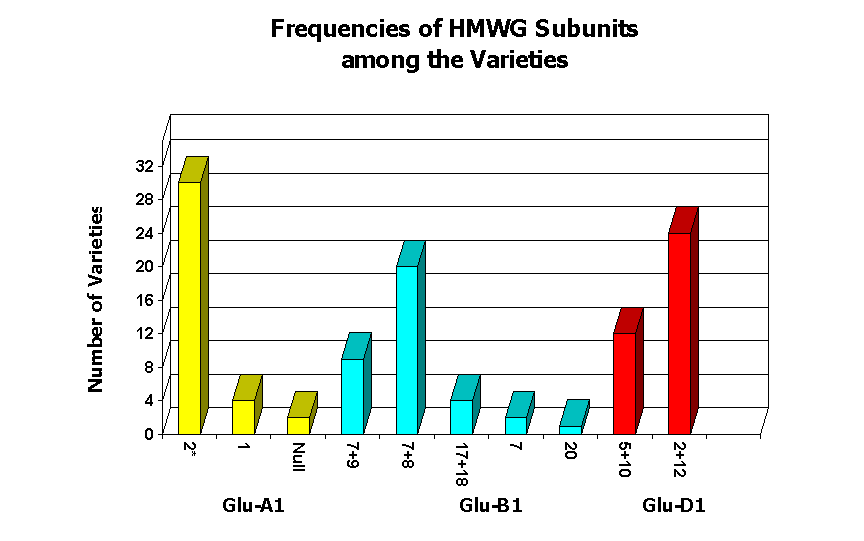 The HMWG subunits encoded by genes at the Glu-A1, Glu-B1 and Glu-D1 loci on chromosomes 1A, 1B and 1D, respectively. The development of quality scoring system based on summarising individual scores prescribed to each allele of all three loci has made it possible to evaluate the potential bread making quality of a variety.