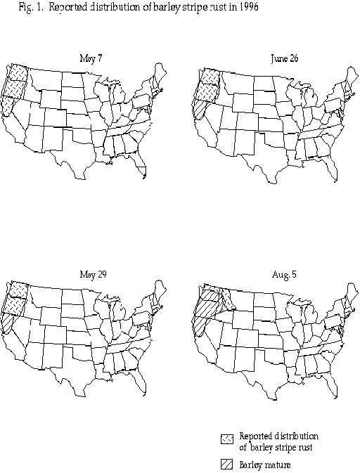 By the third week of March, barley stripe rust was found in nurseries in the Sacramento Valley (Sacramento and Sutter Counties) of California. By the last week in April, stripe rust was severe in susceptible barley cultivars in fields and nurseries in the San Joaquin and Sacramento Valleys. Most barley cultivars in the U.S. are susceptible to stripe rust, but some of the lines in the nurseries were resistant. California reported a 15% yield loss to stripe rust in 1996 (Table 2), which is the greatest loss to barley stripe rust ever recorded in the U.S.