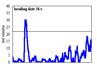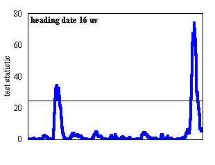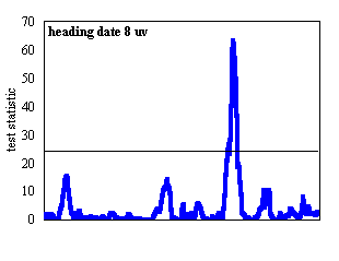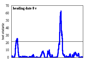 The simplified Composite Interval Mapping (sCIM) approach available in the MQTL software package (Tinker and Mather, 1995) was used for QTL detection in conjunction with the skeleton linkage map. Each data set was analyzed with 1,000 permutations, a 5 cM walk speed, and a Type I error rate of 5%. Eighteen background markers were used, and these markers were spaced evenly across the seven linkage groups. QTL analyses were conducted for eleven phenotypes. QTL for nine of these phenotypes - heading date at 8, 16, and 24 h with and without vernalization; field heading date; and Montana and Oregon field survival - were described by Pan et al., (1994) based on a MAPMAKER/QTL analysis and a 78-point map. QTL for crown fructan content and LT50 (temperature lethal to 50% of a test population) were described by Hayes et al. (1992) using a 33-point map and QTL-STAT. Thus, this report describes QTL for previously-reported phenotypes using a more complete linkage map and contemporary QTL detection procedures.