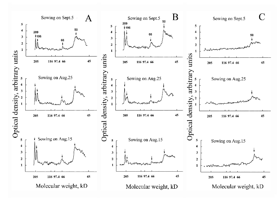 Fig. 25. Density traces of heat-stable proteins extracted from the crowns of winter wheat plants of different ages. Seed was sown on 5, 15, and 25 August and 5 September and sampled on 30 October (a), 16 April (b), and 4 May (c). Electrophoresis was as described in the legend to . COR proteins are indicated by arrows. Molecular weights of proteins are indicated above the the density tracings.