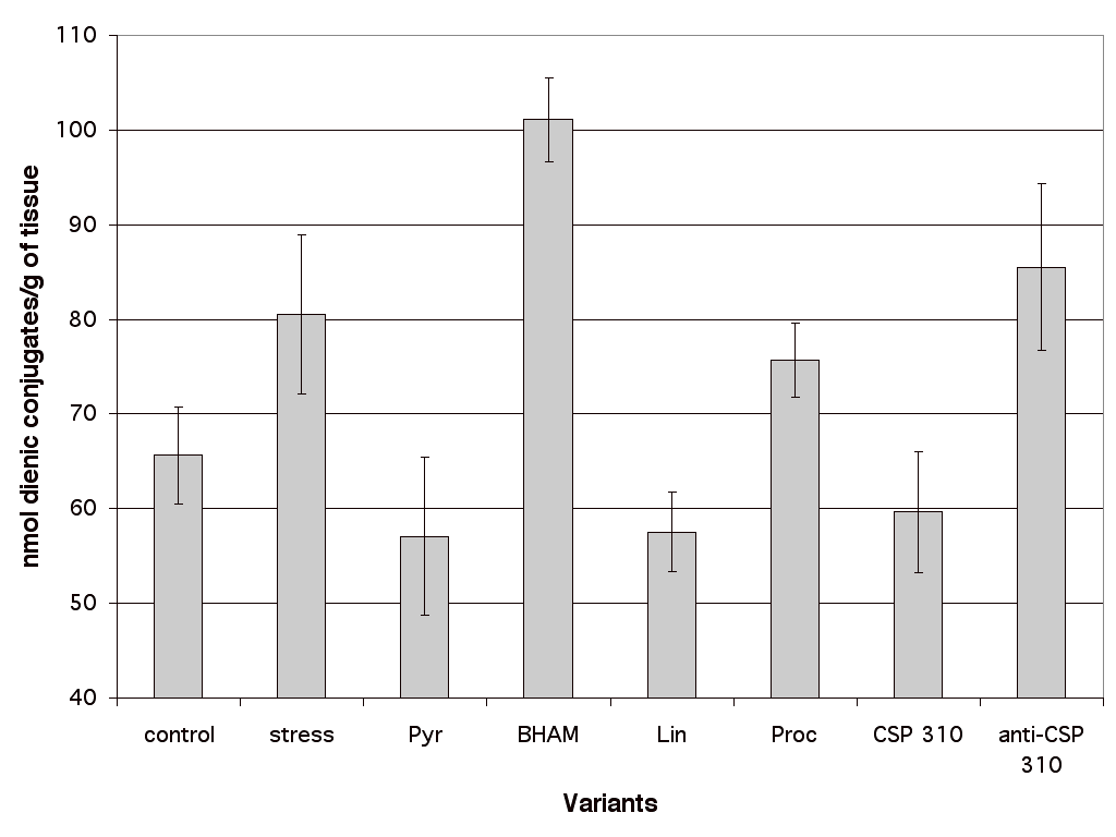 Fig. 5. The influence of activators and inhibitors of known plant uncoupling proteins on lipid peroxidation in winter wheat shoots during cold stress.