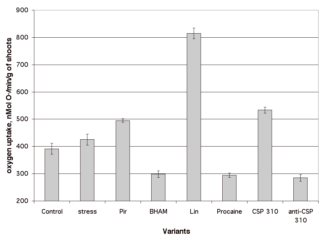 Fig. 6. The influence of activators and inhibitors of known plant uncoupling proteins on oxygen uptake of winter wheat shoots during cold stress.