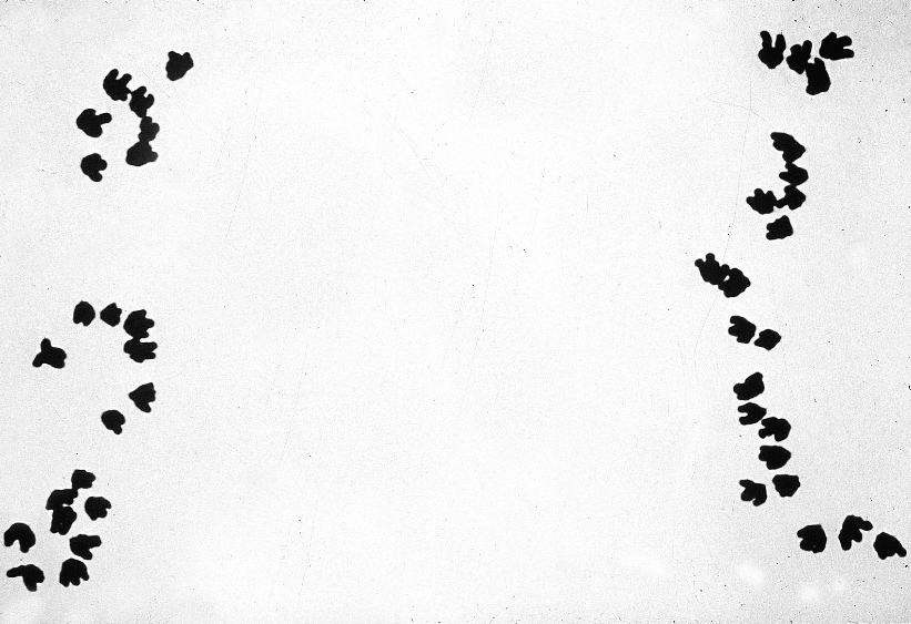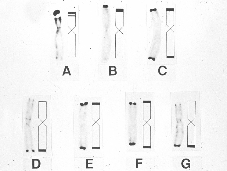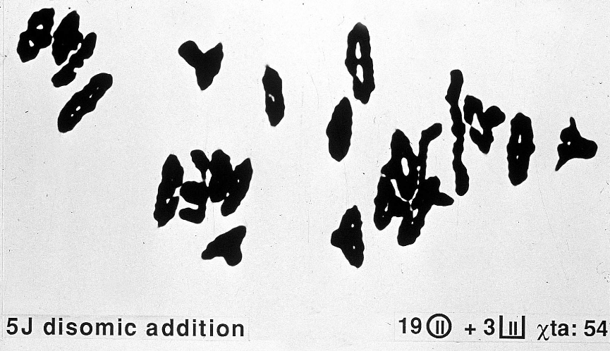 Fig. 2. Details from the wheat/Thinopyrum bessarabicum cross combination showing (a) the seven, Giemsa C-banded chromosomes of Th. bessarabicum, (b) 22 bivalents of a 5J disomic addition line and, (c) a stable 22 + 22 anaphase I separation in the 5J disomic addition line.