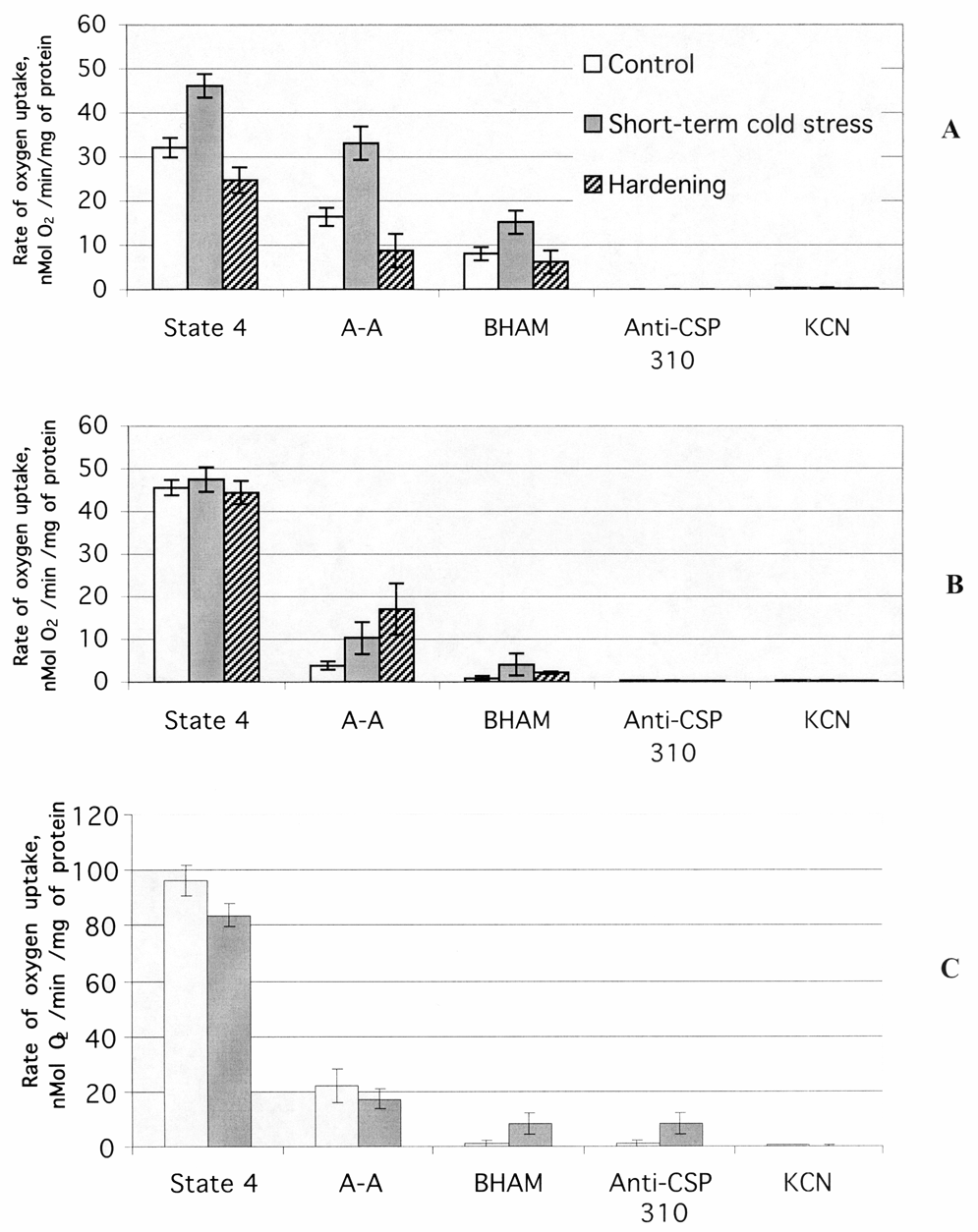 Fig. 1. The effect of different respiratory chain inhibitors on state-4 oxygen uptake by winter wheat mitochondria isolated from control, stressed (short-term cold stress), and hardened (hardening) shoots. The inhibitors were added in the sequence shown reading left to right.