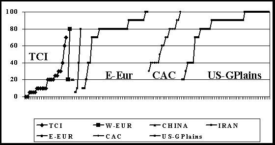 Fig. 2. Maximum scores for resistance to yellow rust across 10 locations in six countries in Central and West Asia and North Africa of 146 entries in the 11th Facultative and Winter Wheat Observation Nursery. Entries within each group of origin are sorted by increasing susceptibility.