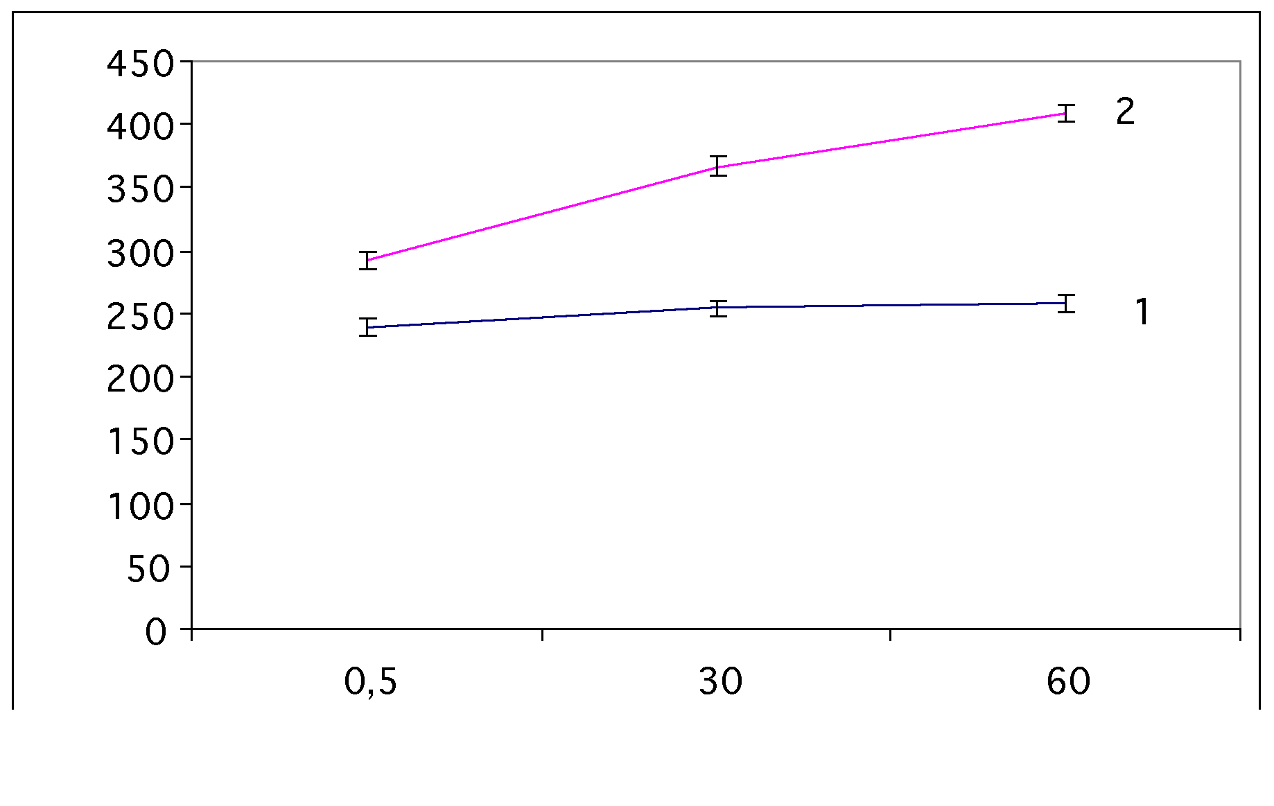 Fig. 11. Change in SH-group concentration (mkM/ml) in soluble proteins of wheat gluten caused by thiol-proteindisulfide oxidoreductase (TPDO). 1. Incubation medium consisting of gluten proteins and GSH cofactor in 0.1 M Tris-HCl buffer and 1 mM EDTA. 2. Incubation medium consisting of gluten proteins, GSH, and TPDO (20 mkM).