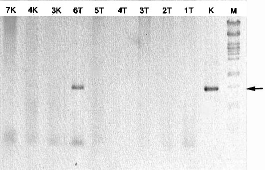 Fig. 16. Results of PCR of DNA of transformed wheat plants of Tulunskaya 12 wheat for the identification of the transgene using primers specific for the A. thaliana FeSOD gene. Lanes 3K, 4K, and 7K are control plants; lanes 1T, 2T, 3T, 4T, 5T, and 6T are transformed plants; lane K is pEXSOD10 (positive control); and lane M is the molecular marker/Pst1. The arrow indicates the position of the PCR product corresponding to the A. thaliana FeSOD gene by size.