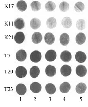 Fig. 18. Determination of paraquat sensitivity in leaves of transformed and control plants of Skala wheat. K17, K11, and K21 are control plants; T7, T20, and T23 are transformed plants. Paraquat concentrations are 1, 0 mM; 2, 0.125 mM; 3, 0.250 mM; 4, 0.5 mM; and 5, 1 mM.