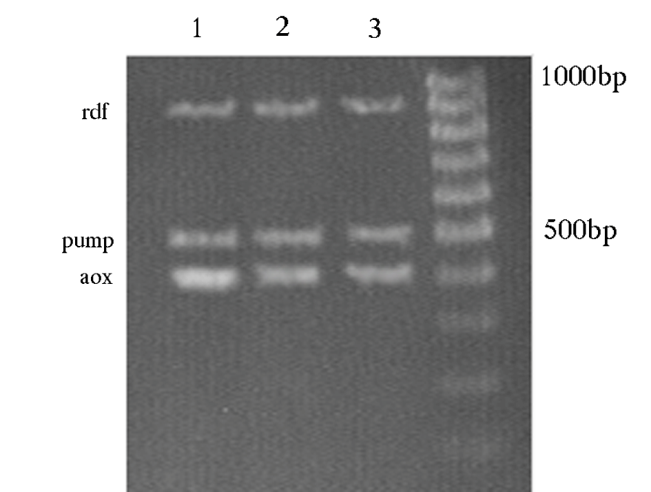 Fig. 7. Electrophoresis of RT-PCR products of aox and pump expression patterns in wheat seedlings under mild low temperature stress (4 C). Lanes 1 - mild low-temperature stress for 24 h; 2 - mild low-temperature stress for 4 h; 3 - control; and 4 - 100-1,000-bp marker.